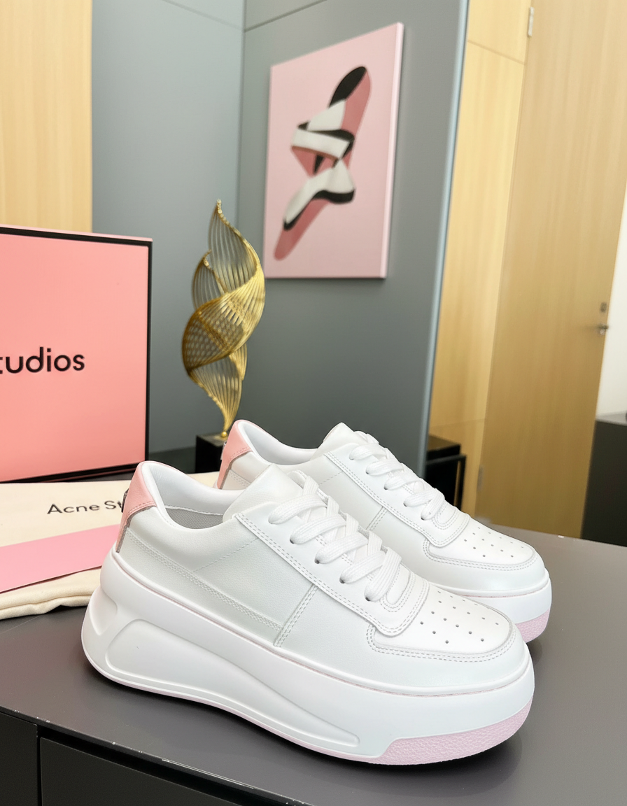 Acne Studios white leather sneakers with pink accents, featuring a chunky sole and lace-up design, perfect for casual and street style fashion.