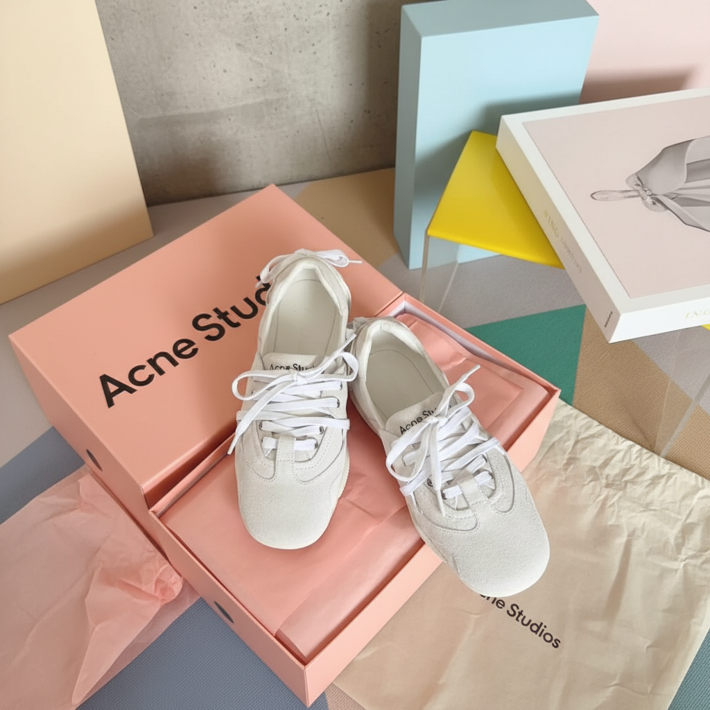 Acne Studios white suede sneakers with lace-up design, minimalist style, and premium craftsmanship, perfect for casual wear and versatile fashion looks.