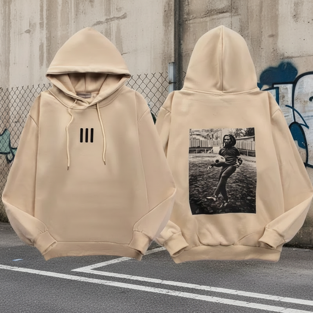 Adidas beige hoodie with photo print back, classic three-stripe front detail, soft fabric, casual streetwear style for men and women.