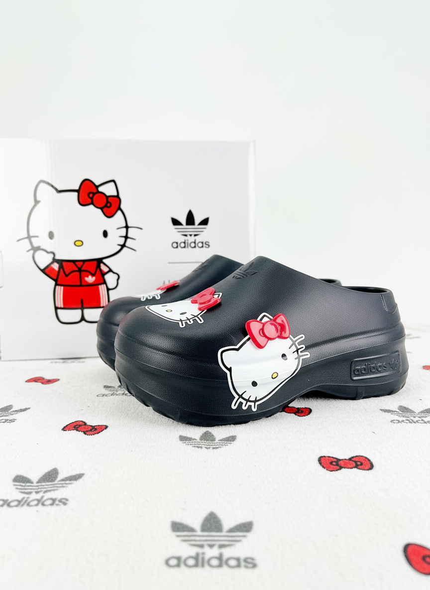 Adidas Hello Kitty black clog sandals with cute red bow design, lightweight and comfortable, perfect for casual wear and everyday style.