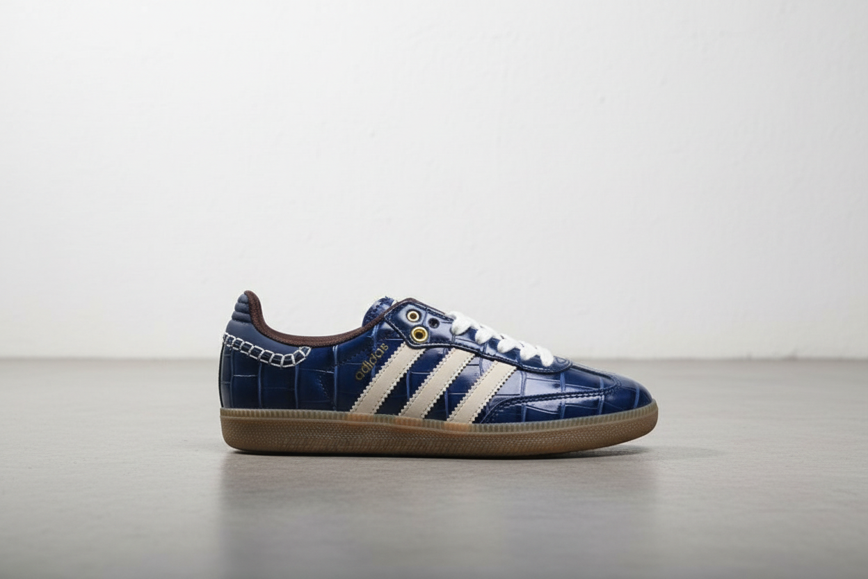 Adidas blue crocodile pattern sneakers with signature three stripes, gold eyelet accents, and durable gum sole for premium style and comfort.