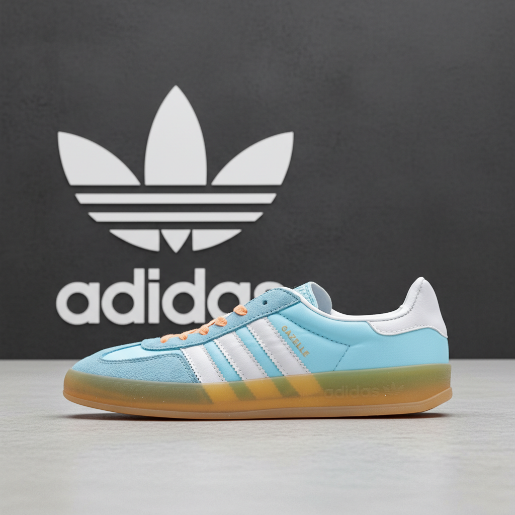 Adidas Gazelle sneakers, blue and white design with gum sole, classic retro style, comfortable fit, sizes 36-45, perfect for casual wear and street fashion lovers.