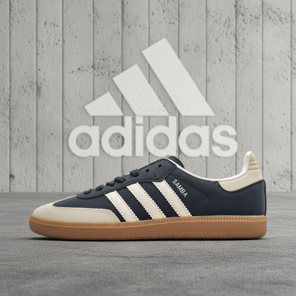 Adidas Samba Classic sneakers with black and beige leather upper, signature three stripes, and durable gum sole, perfect for casual wear and sports style.