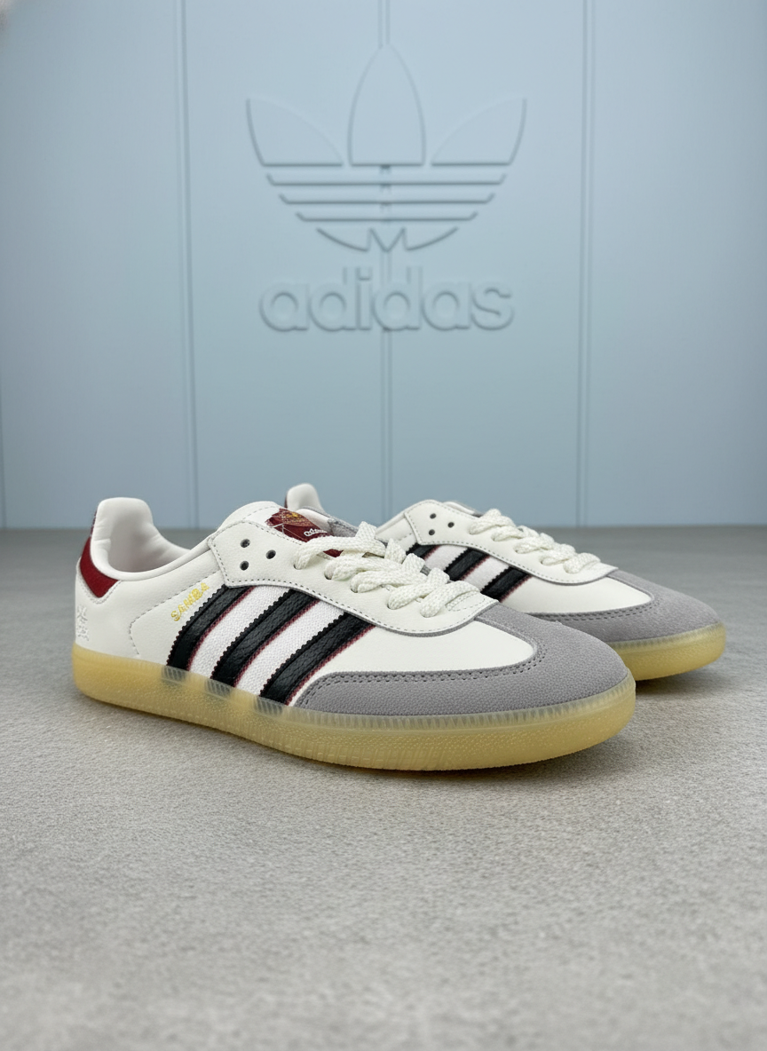Adidas Samba sneakers, classic white leather with grey suede toe, black and red stripes, gum sole, perfect for casual wear and street style.