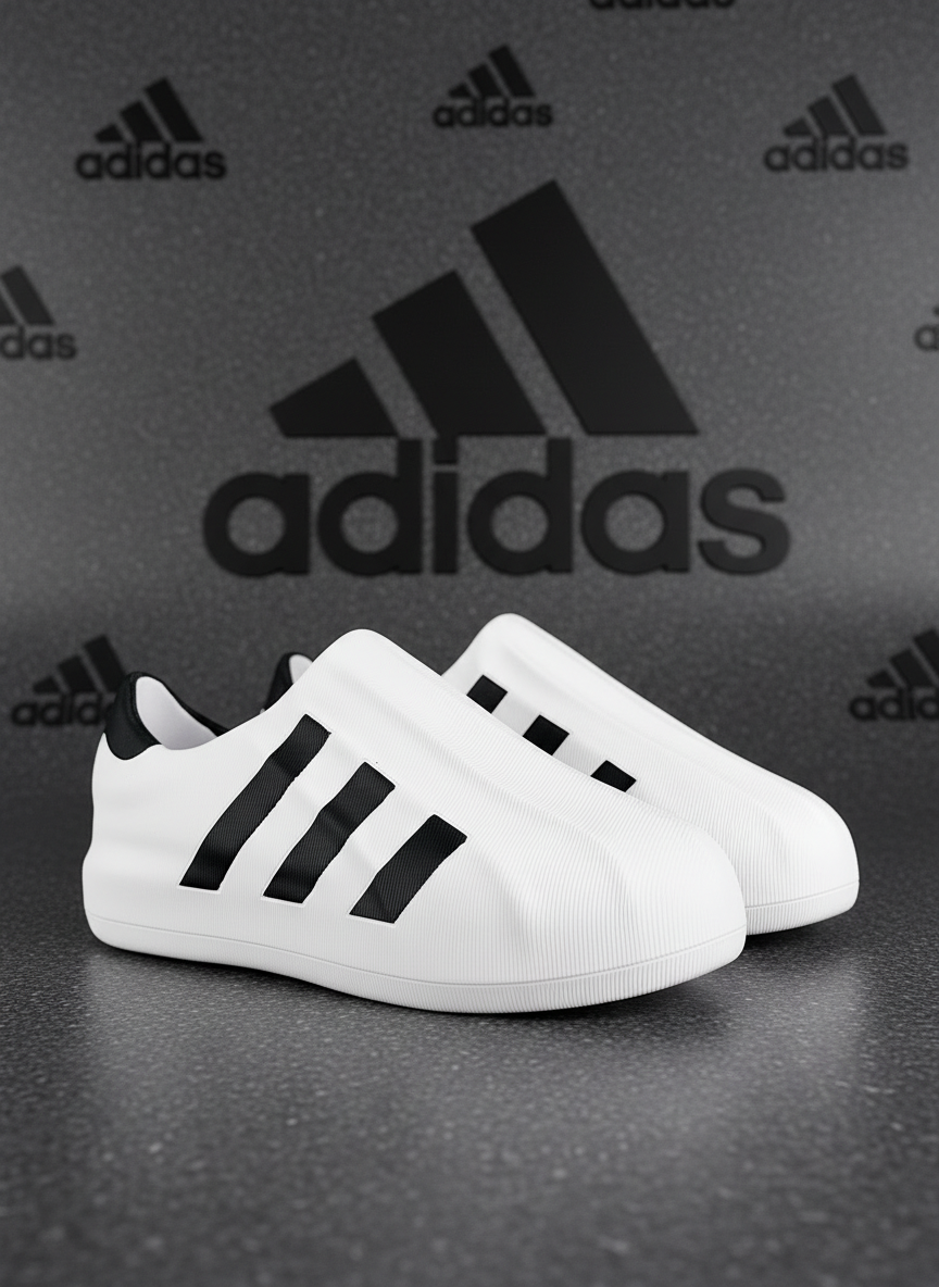 Adidas white slip-on sneakers with black stripes, lightweight and stylish, perfect for casual wear and travel, offering comfort and modern sports fashion.