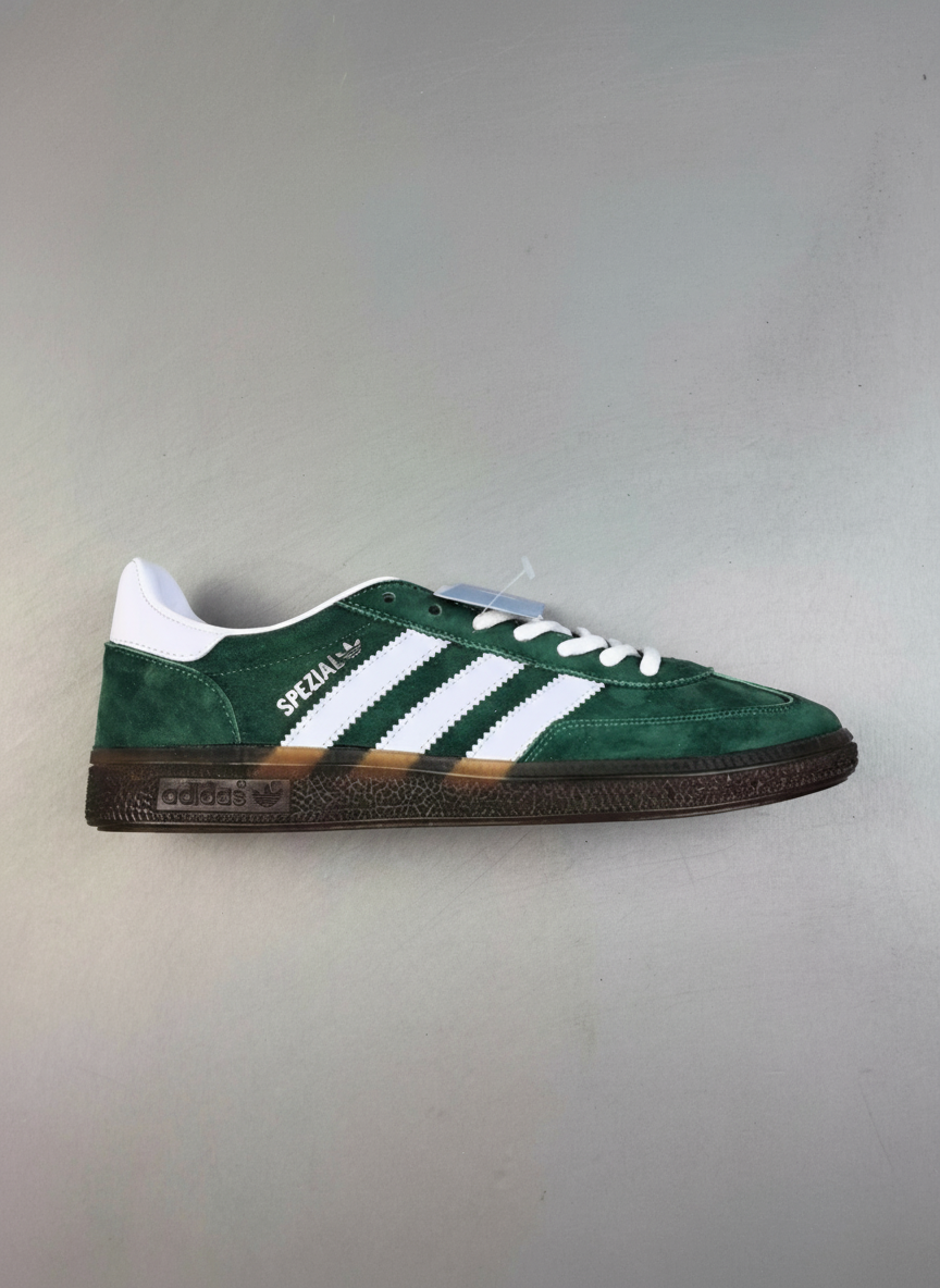 Adidas Spezial green suede sneakers with white stripes, durable gum sole, classic retro style, sizes 36-45.