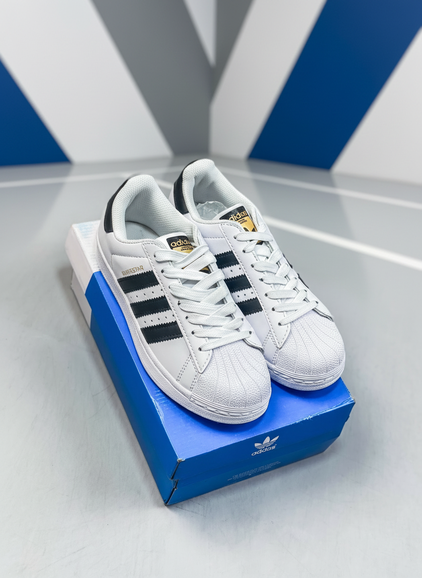 Adidas Superstar classic white leather sneakers with black stripes, durable shell toe, unisex style, sizes 36-45, perfect for casual wear and street fashion.