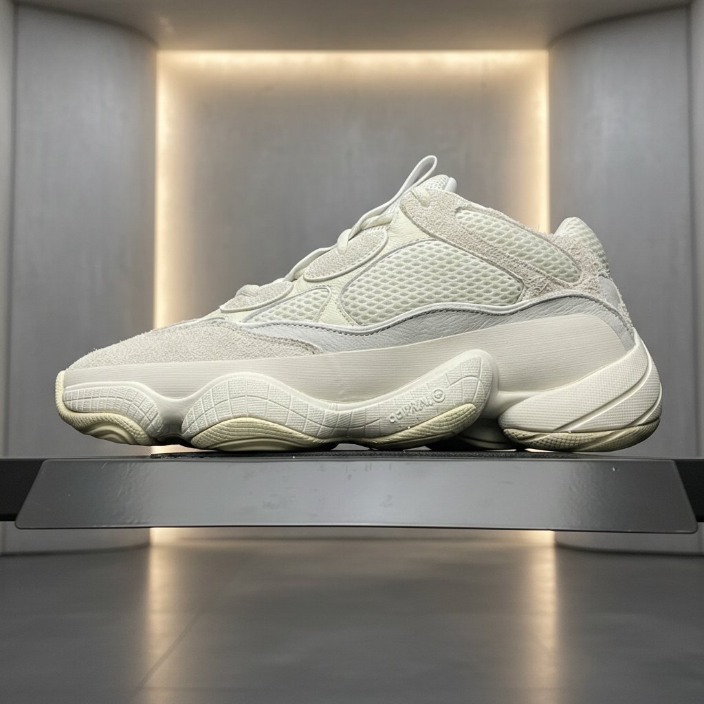 Adidas Yeezy 500 sneakers in sleek off-white, featuring premium suede, breathable mesh, and Adiprene cushioning for all-day comfort and modern streetwear style.