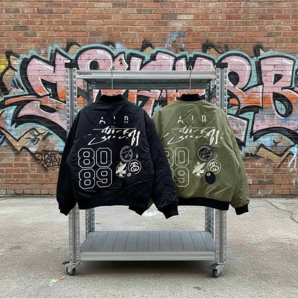 AIR Street Style Bomber Jacket, Retro 80 89 Print, Black or Army Green, Casual Outerwear for Men and Women, Trendy Fashion Coat