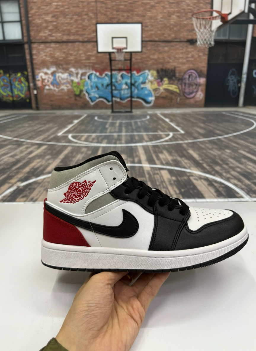 Air Jordan 1 Mid Black White Red Leather Sneakers, iconic design, durable comfort, perfect for basketball and streetwear fashion.