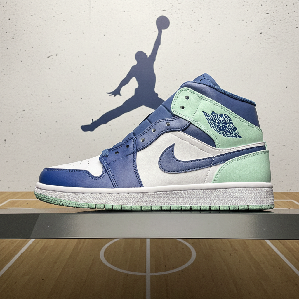 Air Jordan Retro High OG sneakers in blue, white, and mint green, premium leather, classic basketball style, perfect for streetwear and sports.