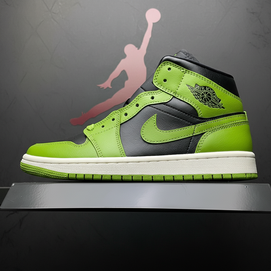 Air Jordan 1 Mid Green Black sneakers, premium leather, iconic Swoosh, high-top design, cushioned sole for comfort, perfect for streetwear and basketball.