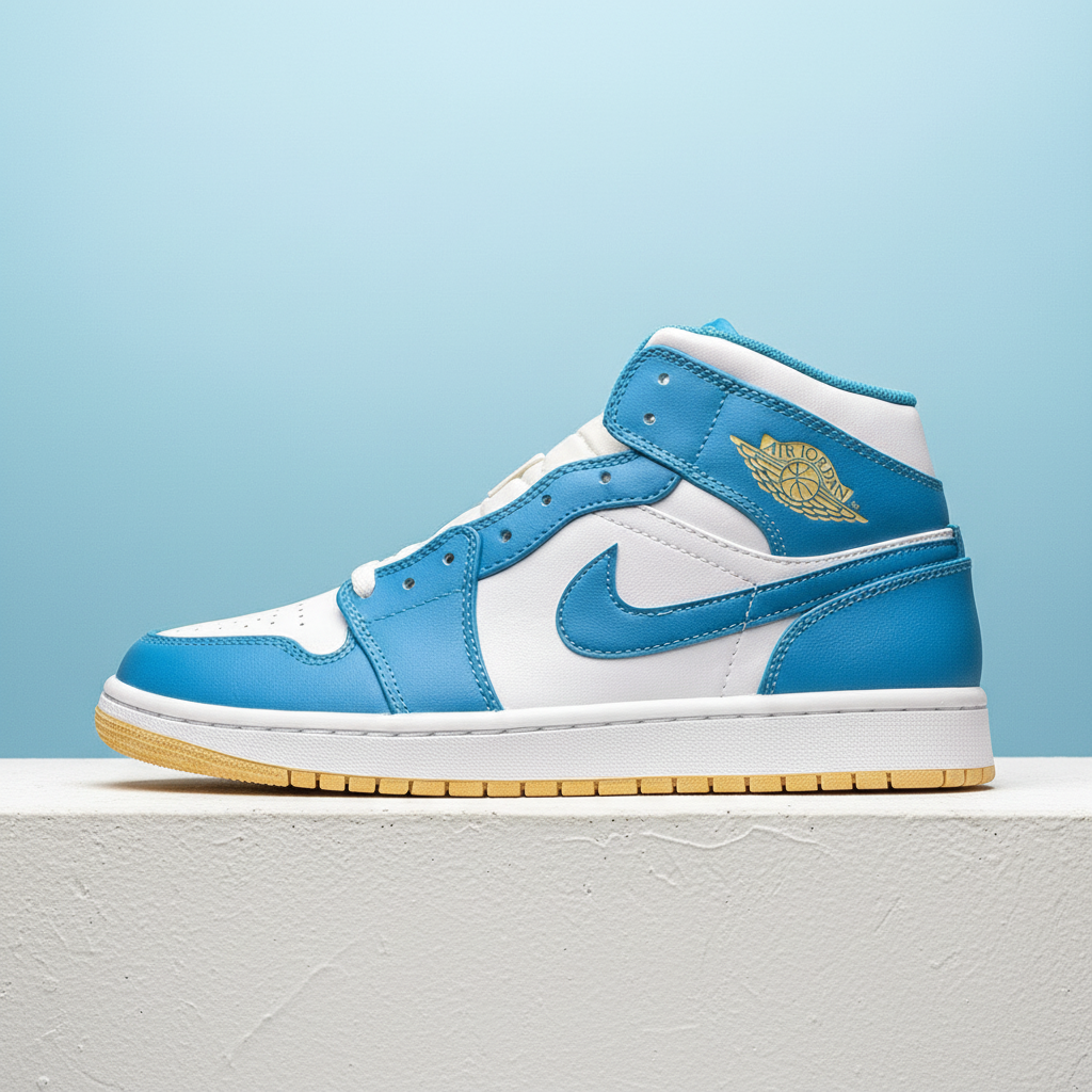 Air Jordan Retro High Sneakers in White and Blue, premium leather upper, iconic Nike Swoosh, classic basketball style, durable sole for street and sport performance.
