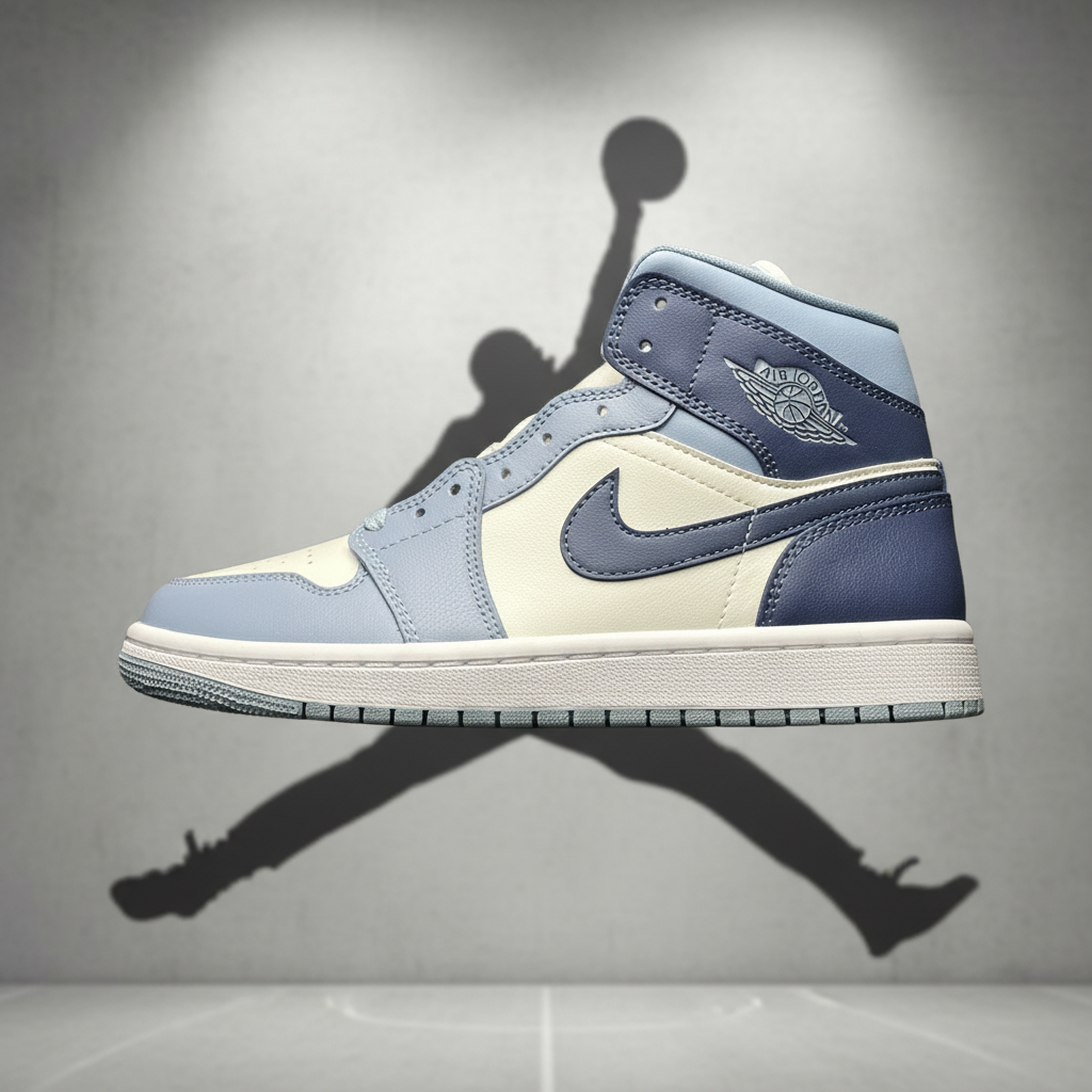 Air Jordan 1 High Retro sneakers in light blue and white, premium leather upper, classic basketball style, iconic Nike Swoosh, durable rubber sole for comfort and performance.
