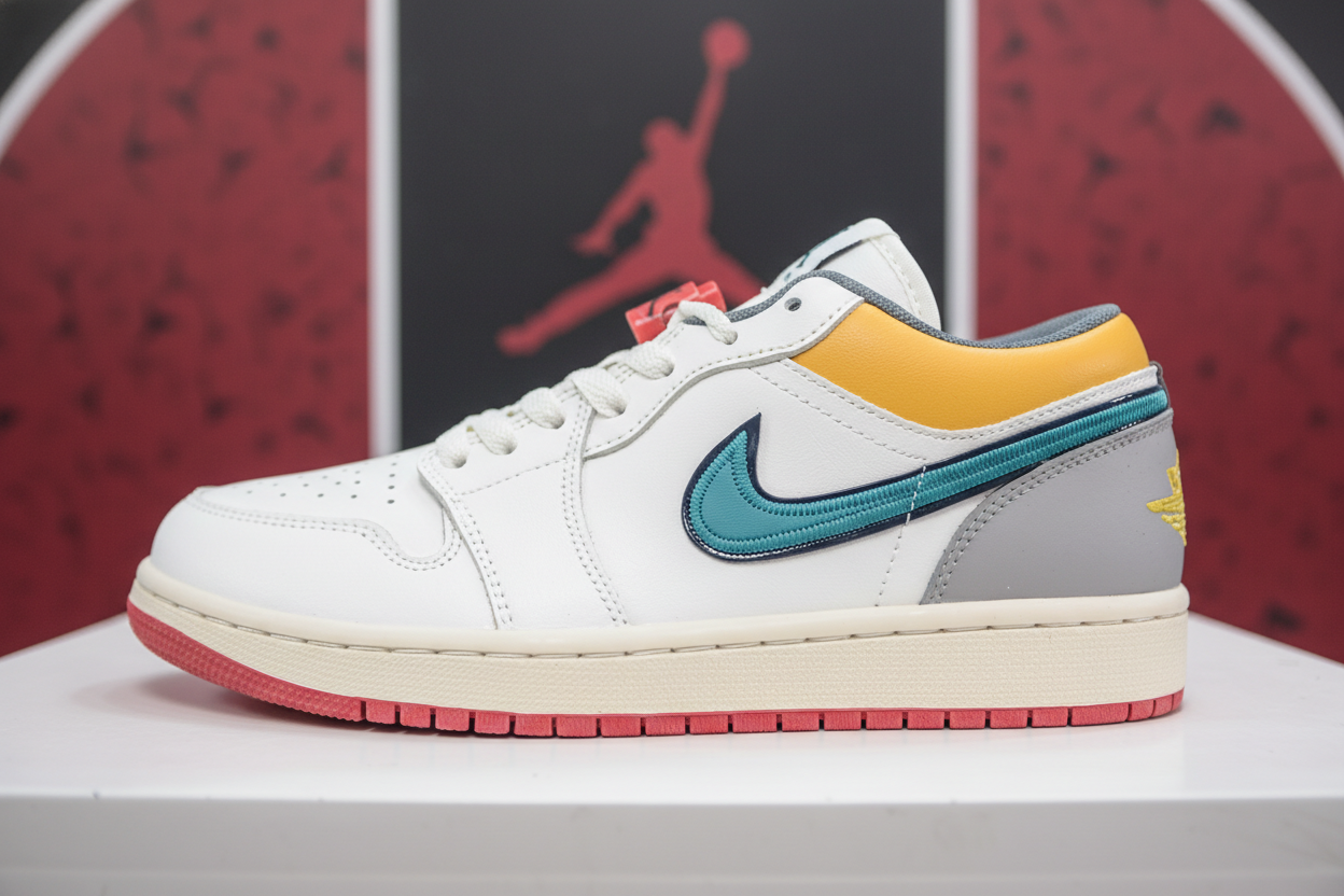 Air Jordan Low sneakers with premium leather, multicolor design, cushioned sole, and iconic Nike Swoosh for style and comfort. Perfect for casual wear and sports.