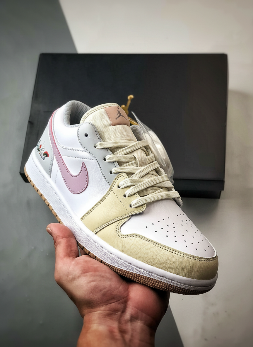 Air Jordan Low sneakers with pastel pink Swoosh, cream leather accents, floral embroidery, and gum sole, combining retro style with modern comfort for everyday wear.
