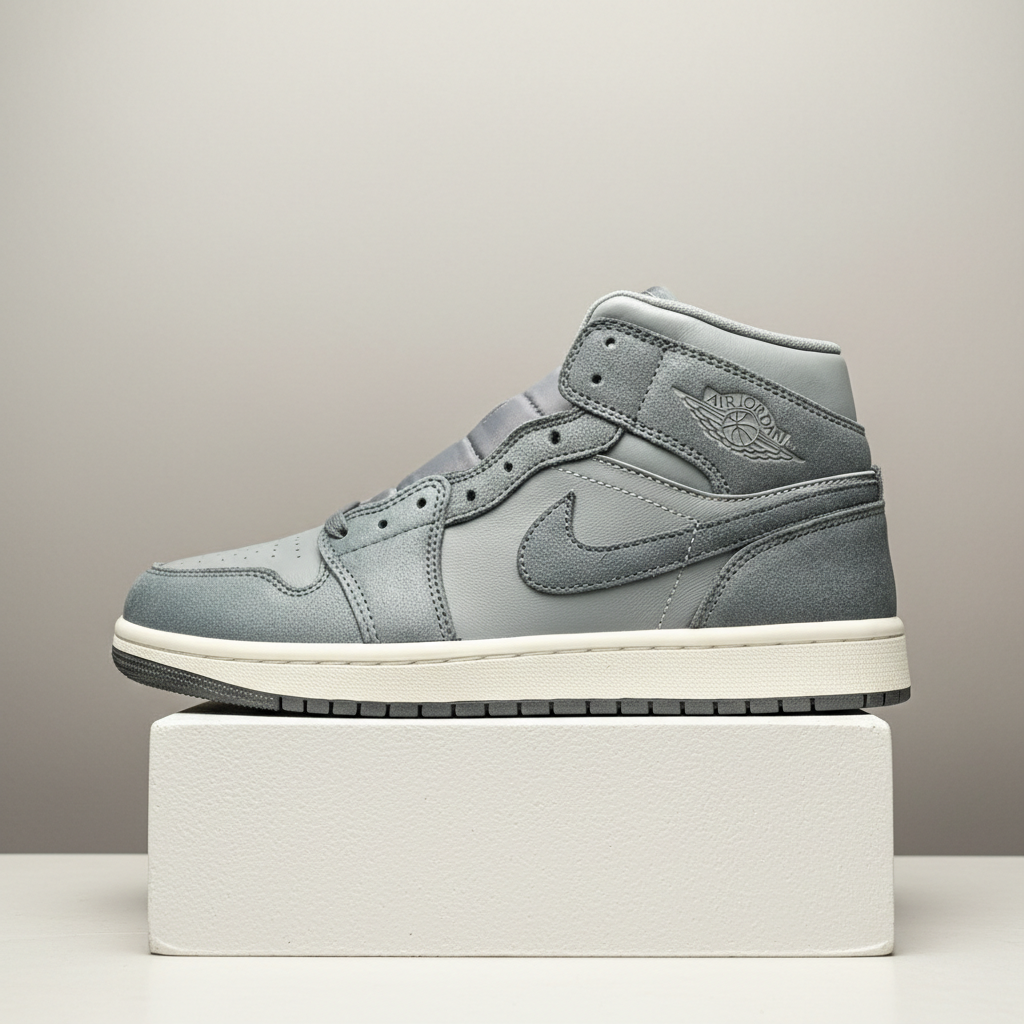 Air Jordan 1 Mid Retro Grey Leather Sneakers, classic basketball-inspired style with premium suede overlays, durable rubber sole, and iconic Nike Swoosh for streetwear and sports.