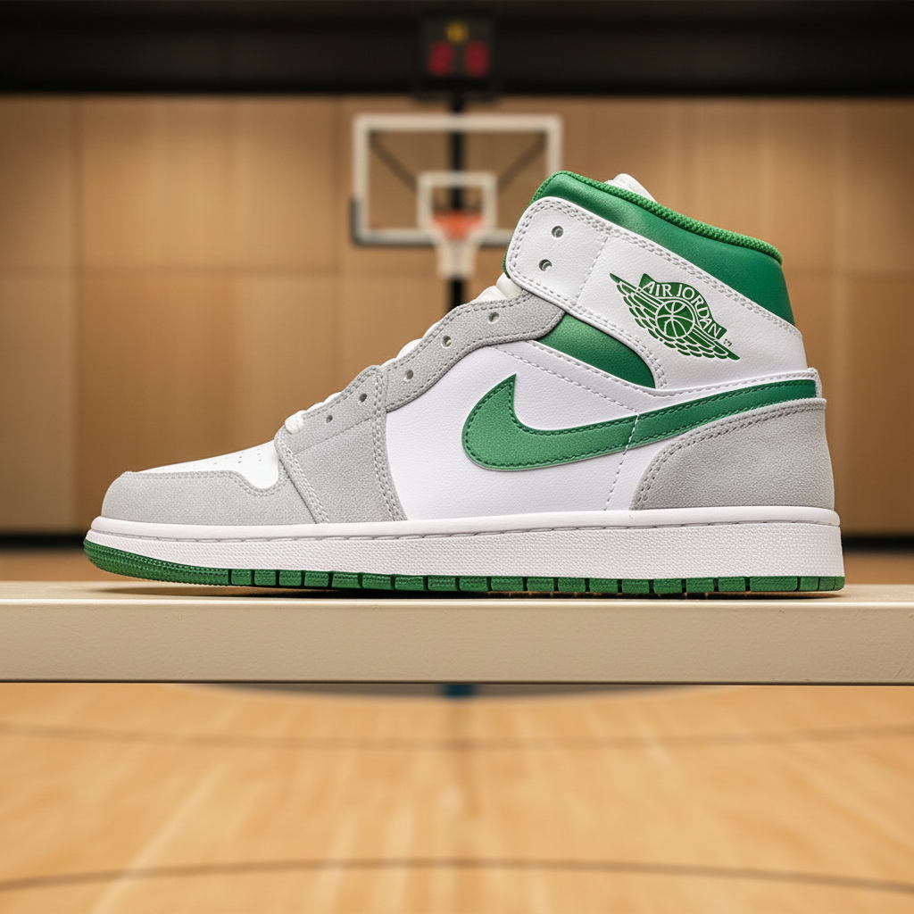 Air Jordan sneakers in white, grey, and green with premium materials, iconic logo, and comfortable fit, perfect for basketball, streetwear, and everyday style.