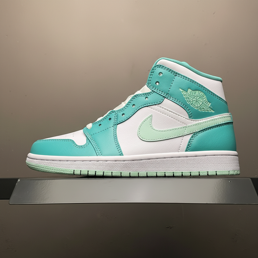 Air Jordan 1 Mid White Mint Green Sneakers, stylish high-top design with premium leather, cushioned comfort, and iconic Nike swoosh for everyday wear and sports.