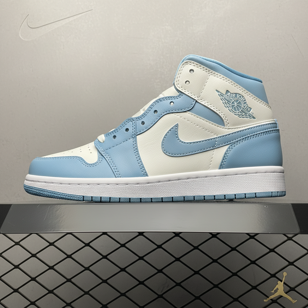 Air Jordan 1 Mid Retro sneakers in white and university blue, premium leather, iconic Swoosh, classic basketball style, perfect for streetwear and casual fashion.