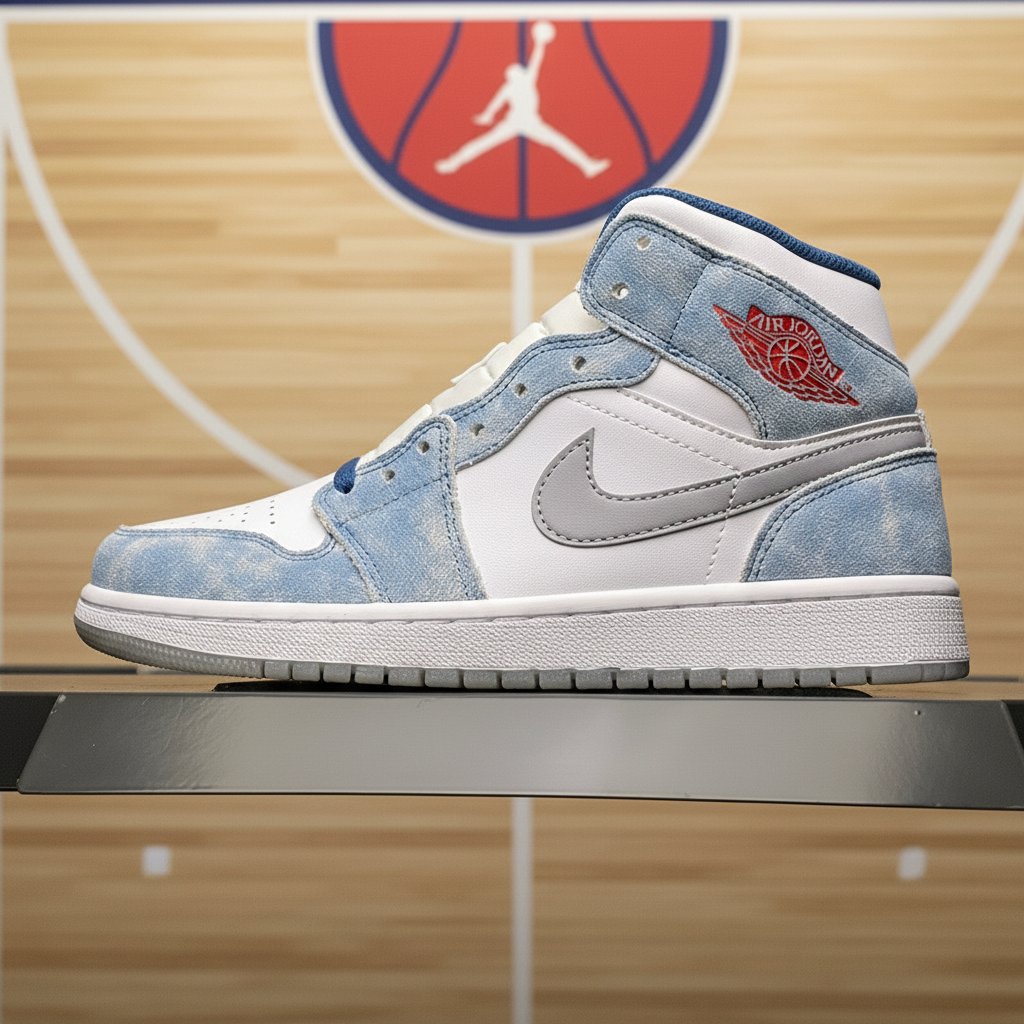 Air Jordan Retro High OG sneakers with white leather and washed blue suede, iconic Swoosh, and classic red Wings logo for timeless streetwear style.