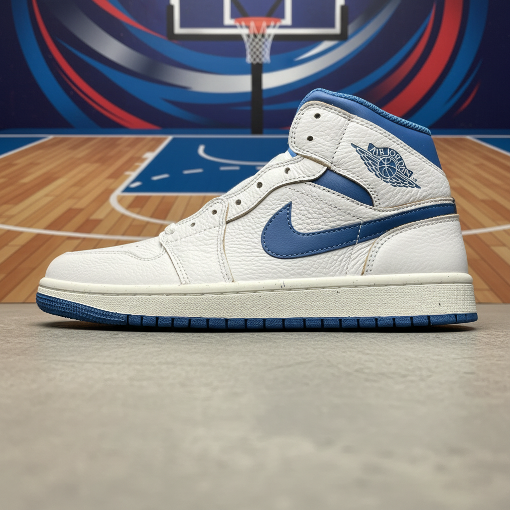 Air Jordan 1 Retro High White Blue Leather Sneakers, iconic basketball shoes with premium materials, cushioned sole, and classic sporty style for streetwear and casual fashion.