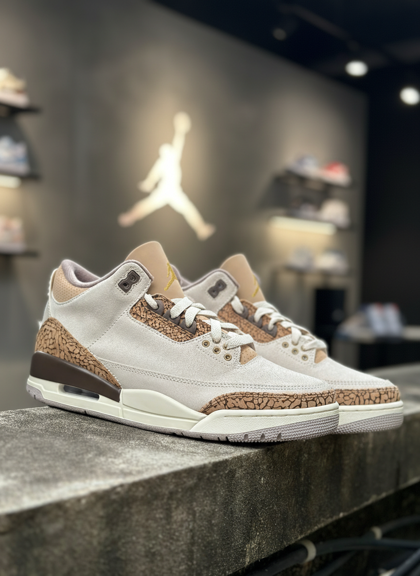 Air Jordan Retro 3 sneakers in beige with brown elephant print, premium suede upper, cushioned sole, and iconic style for basketball and streetwear fashion.