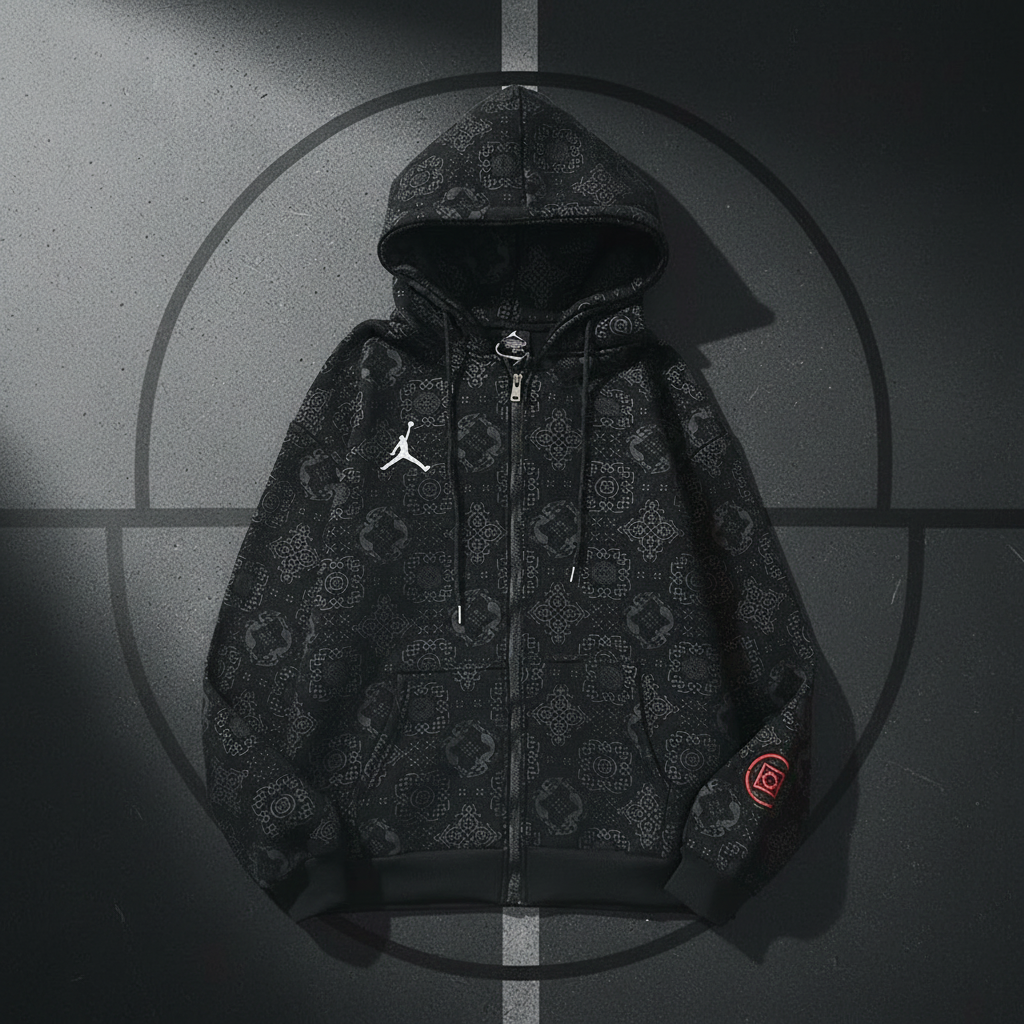 Air Jordan Black Pattern Zip-Up Hoodie with Drawstring Hood, Front Pockets, and Iconic Jumpman Logo for Casual Streetwear Style.
