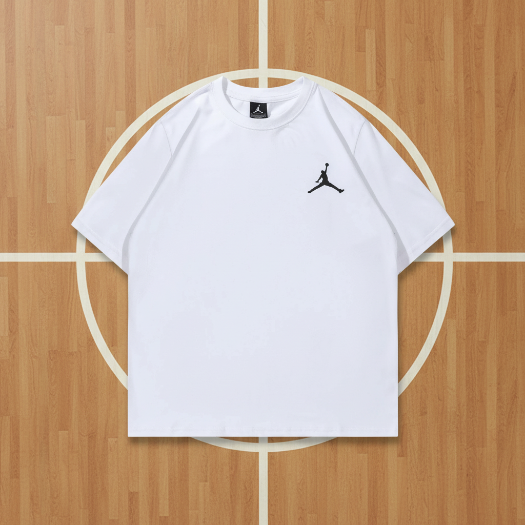 Air Jordan Men’s White Logo T-Shirt, classic crew neck sportswear, premium cotton, breathable and comfortable for casual or athletic wear.