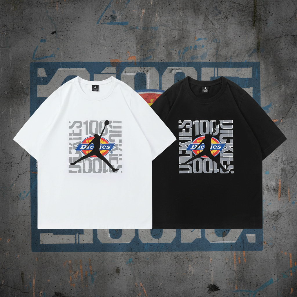 Air Jordan Dickies Logo Graphic T-Shirts, casual streetwear style, breathable cotton fabric, classic black and white colors for everyday wear and sports fashion.