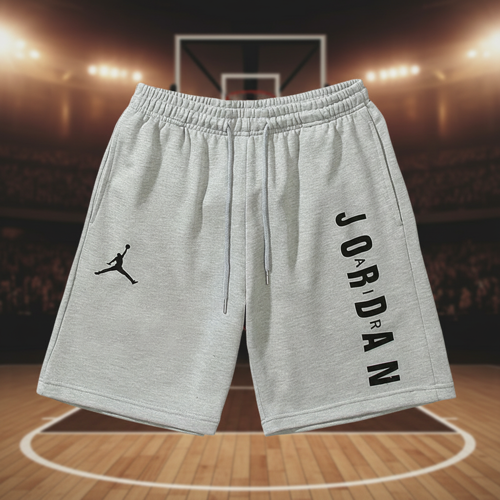Air Jordan men’s casual grey shorts with elastic waist, drawstring, and logo print, perfect for sports, training, and streetwear style.
