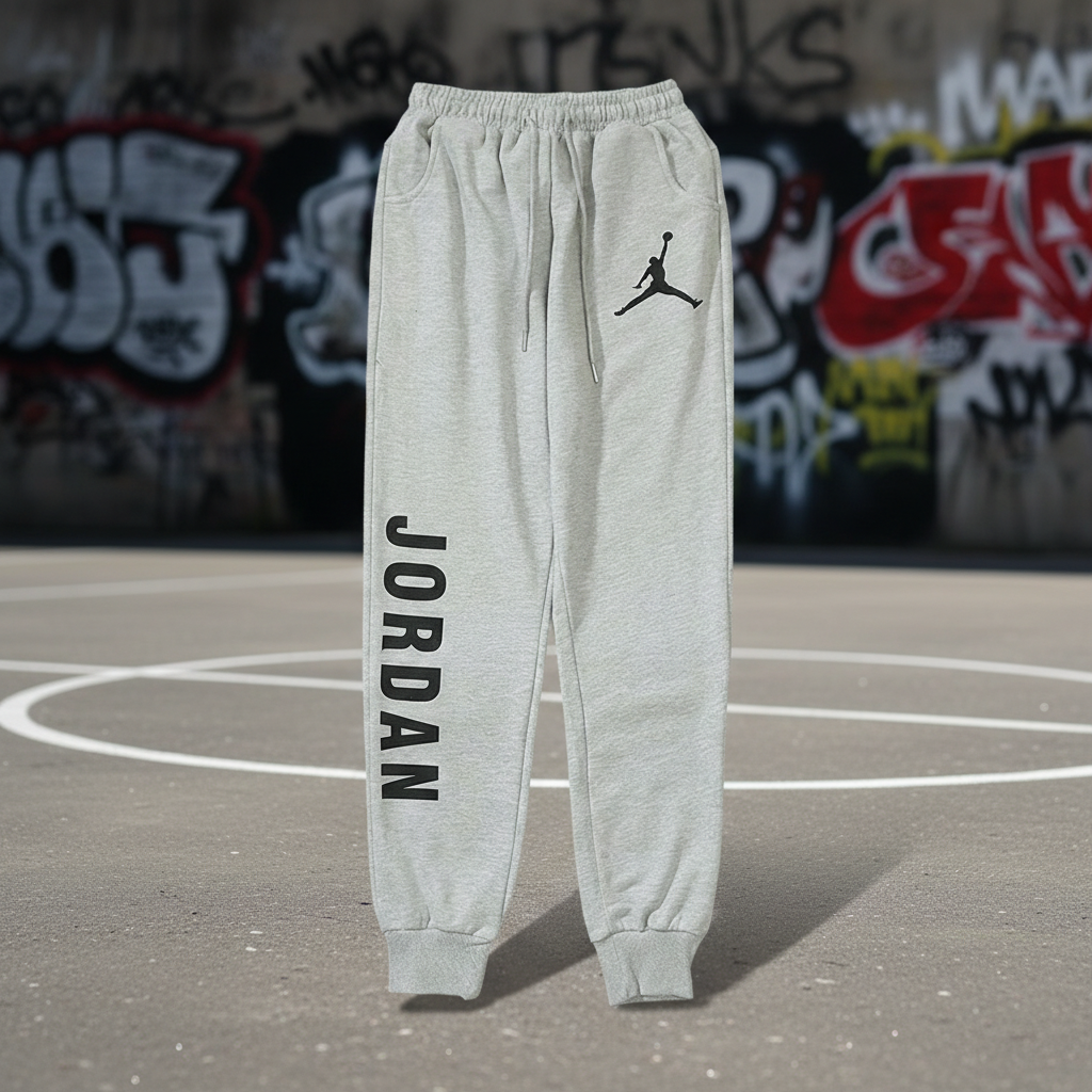 Air Jordan grey jogger pants with iconic Jumpman logo, elastic waistband, adjustable drawstring, side pockets, and bold JORDAN lettering for sporty casual style.