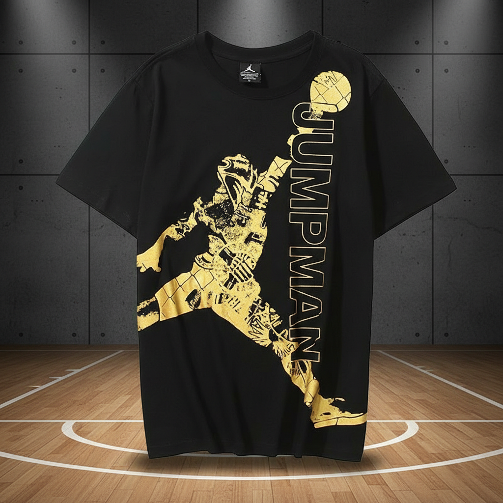 Air Jordan Jumpman Black T-Shirt with Bold Gold Graphic, Premium Cotton Tee for Basketball Fans and Streetwear Style