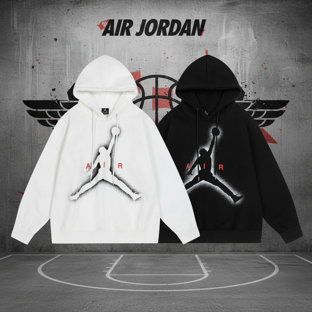 Air Jordan Hoodies featuring iconic Jumpman logo, available in black and white, premium cotton, perfect for streetwear style and sports comfort.