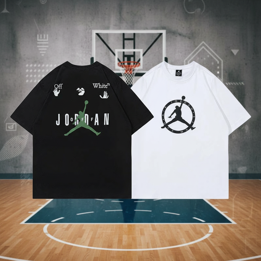 Air Jordan Off-White Style T-Shirts, casual round neck, breathable cotton, trendy sports streetwear for men and women.
