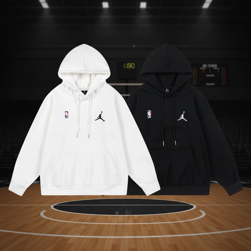 Air Jordan NBA Logo Hoodies, premium cotton, classic black and white, casual sportswear, comfortable fit for men and women, perfect for streetwear and basketball fans.