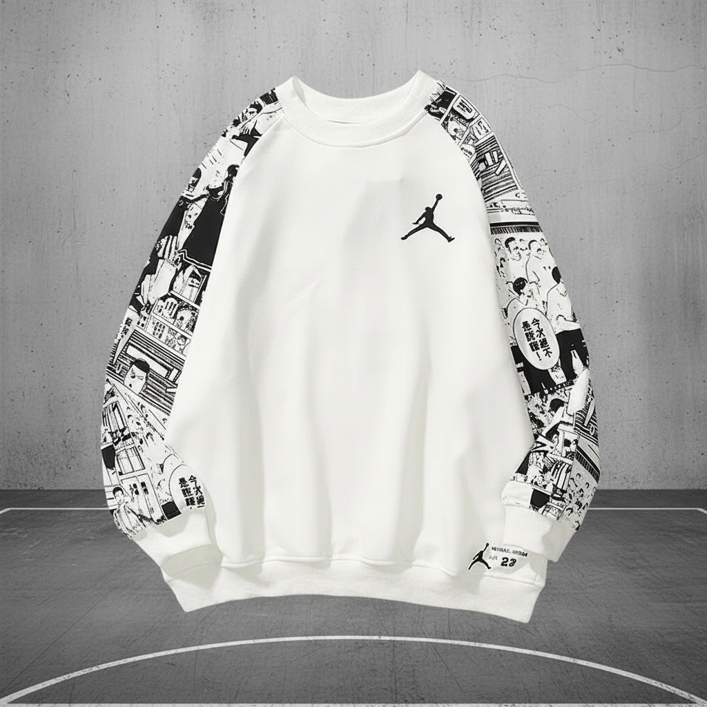 Air Jordan Graphic Sleeve Hoodie, stylish white sweatshirt with comic print sleeves, premium comfort for streetwear and sports fashion lovers.