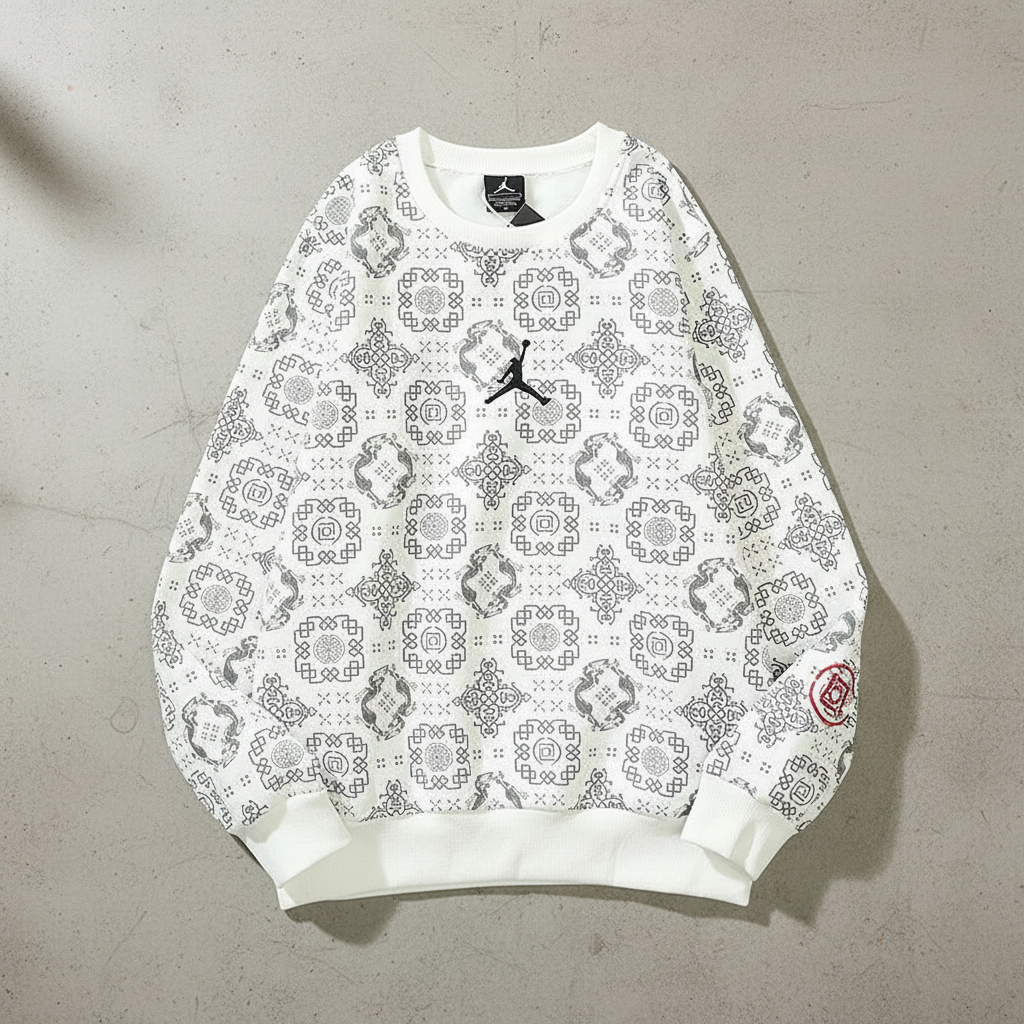 Air Jordan White Patterned Hoodie, stylish streetwear sweatshirt with unique geometric print, premium comfort for casual wear and sports fashion.