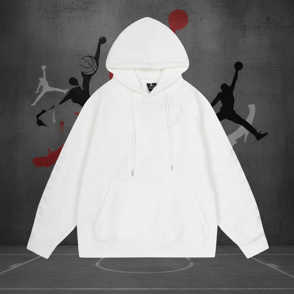 Air Jordan White Pullover Hoodie, premium cotton, classic Jumpman logo, long sleeve, front pocket, casual sportswear for comfort and style.