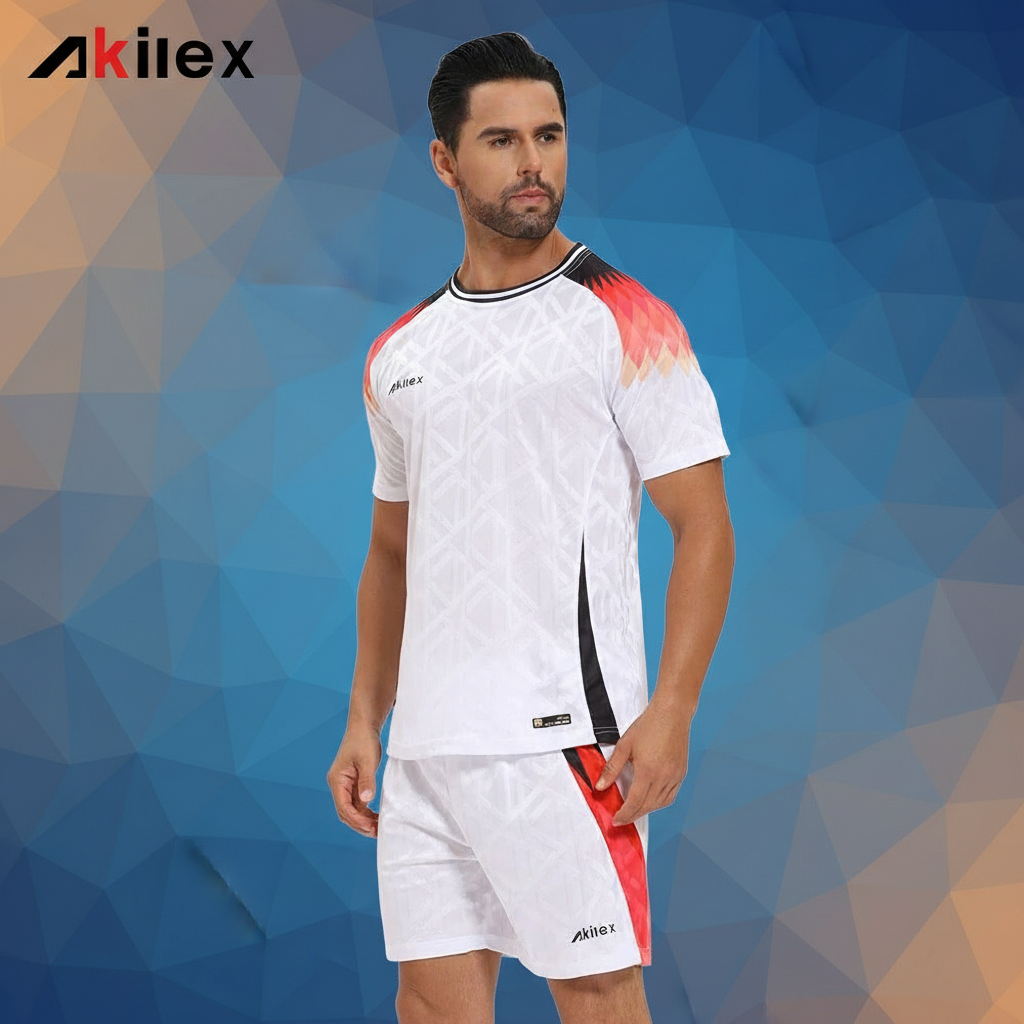 Akilex Men’s Sportswear Set, breathable quick-dry soccer training jersey and shorts, stylish white with red gradient shoulders for active performance.