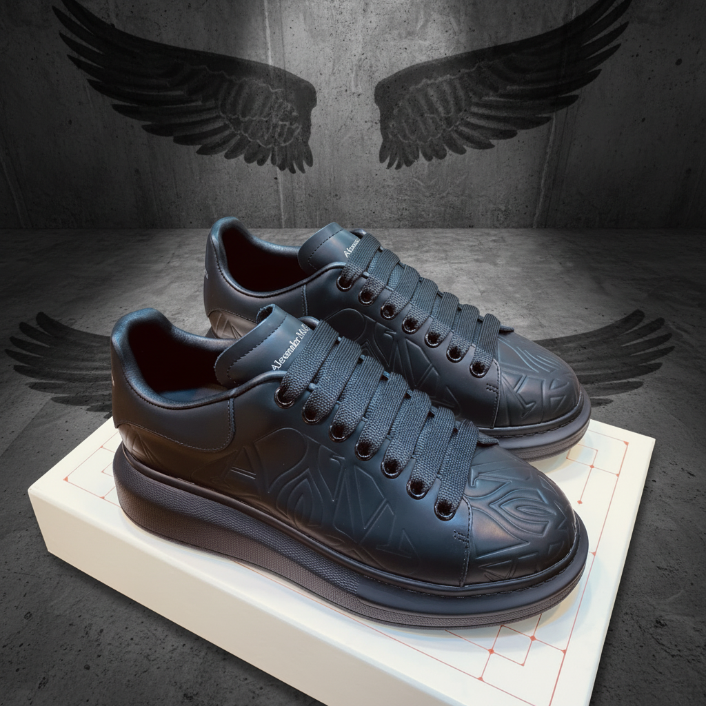 Alexander McQueen black embossed leather sneakers, featuring bold design, chunky sole, and premium craftsmanship for a stylish and comfortable fit.