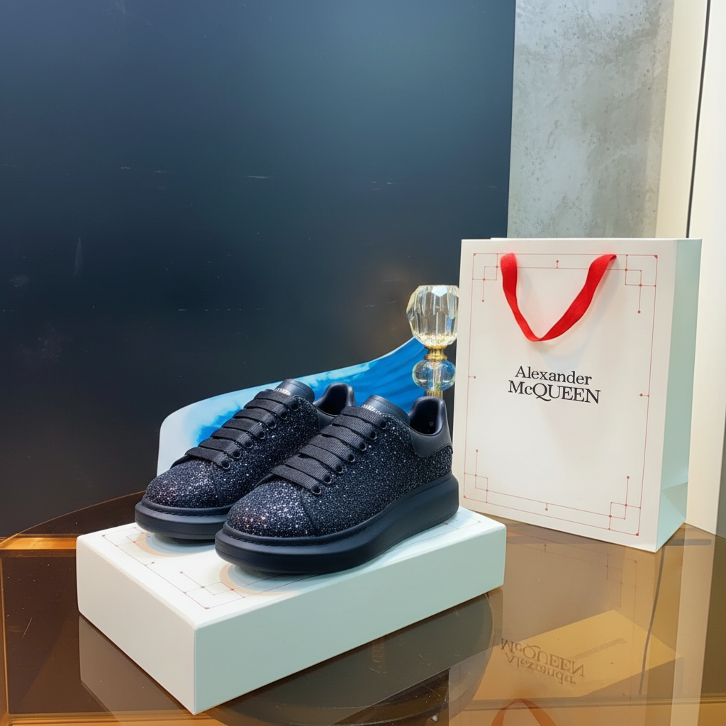 Alexander McQueen black glitter oversized sneakers, luxury designer footwear with sparkling finish, stylish chunky sole, perfect for fashion-forward looks and premium comfort.