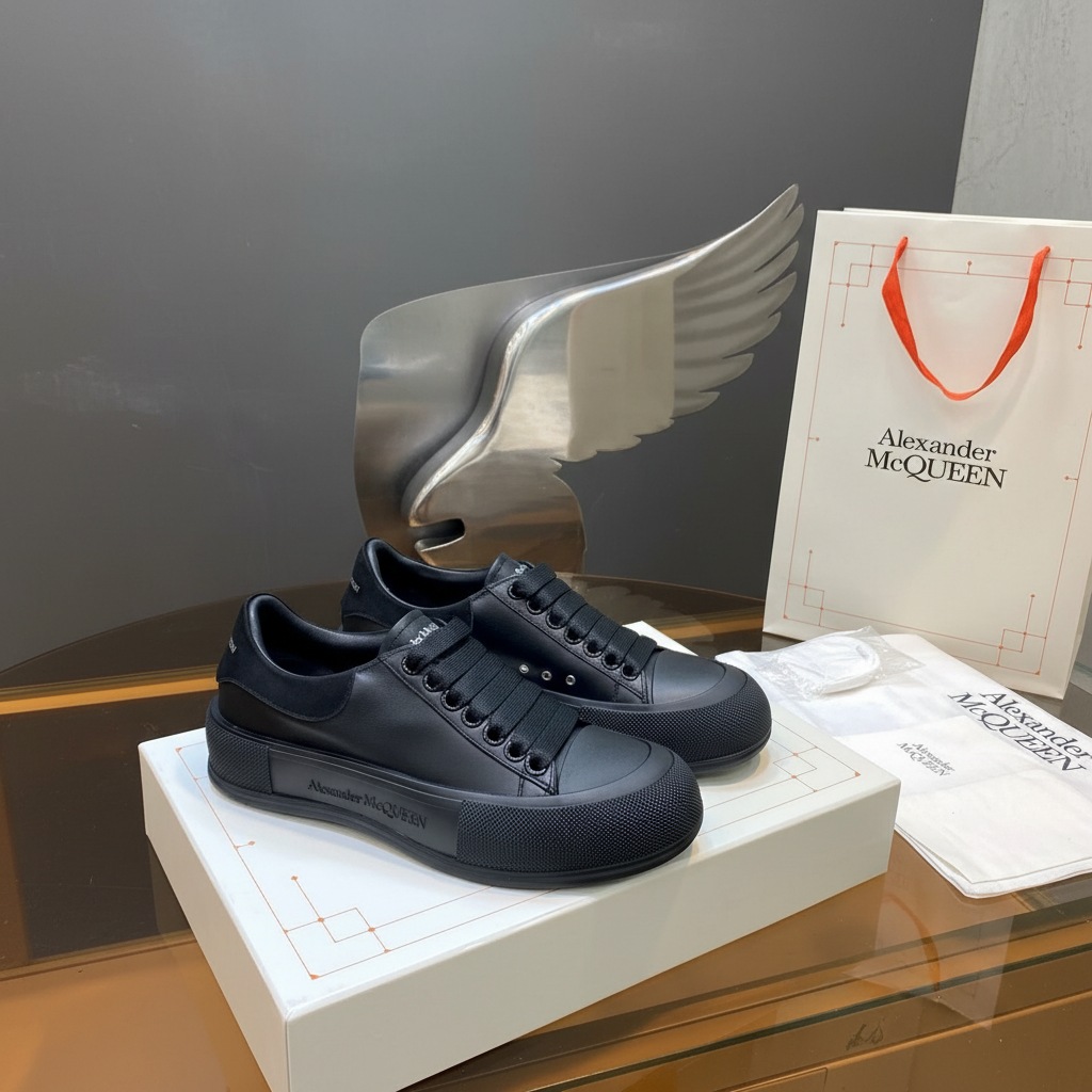 Alexander McQueen black leather sneakers with sleek design, durable rubber sole, and modern lace-up style, perfect for casual wear and luxury street fashion.