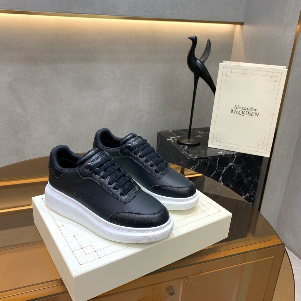 Alexander McQueen black leather sneakers with chunky white sole, stylish design, premium comfort, perfect for casual wear and fashion-forward looks.
