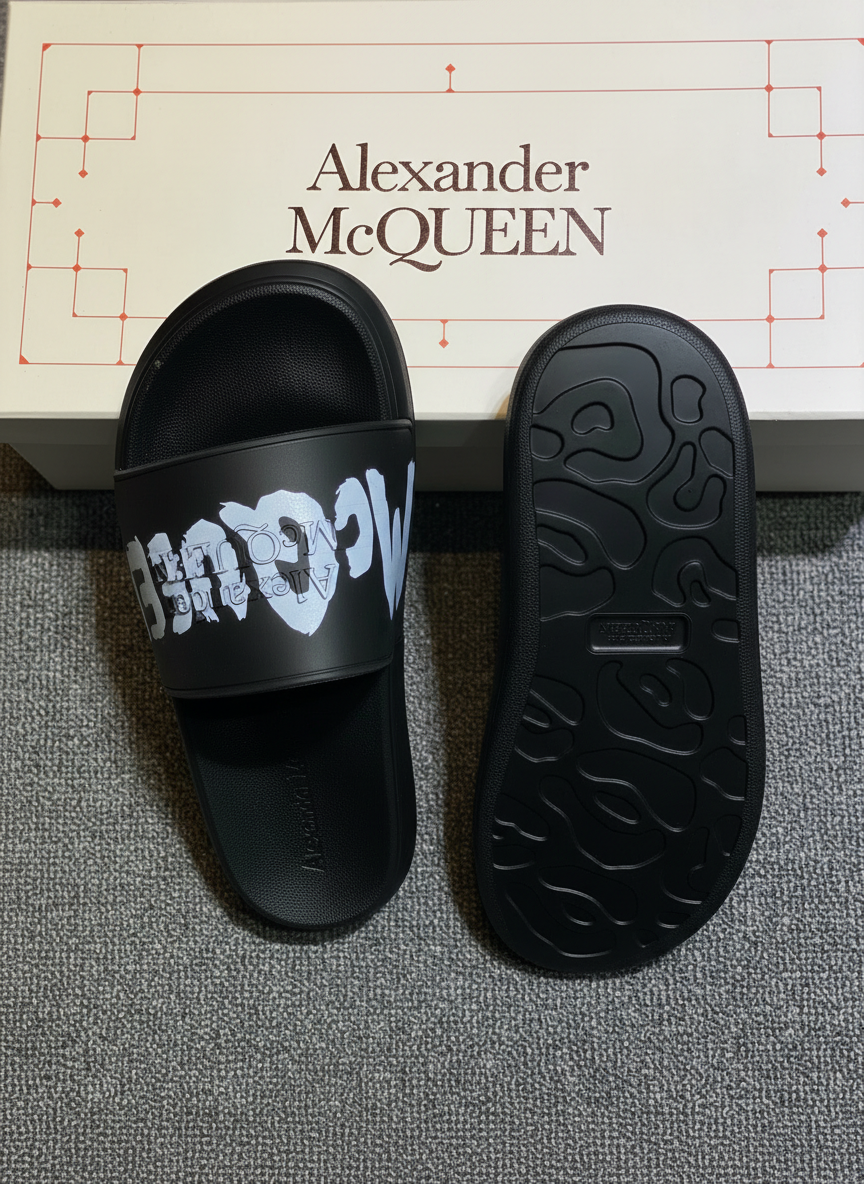 Alexander McQueen black logo slide sandals, stylish and comfortable slip-on design, perfect for casual wear, durable sole for all-day support and fashion-forward look.