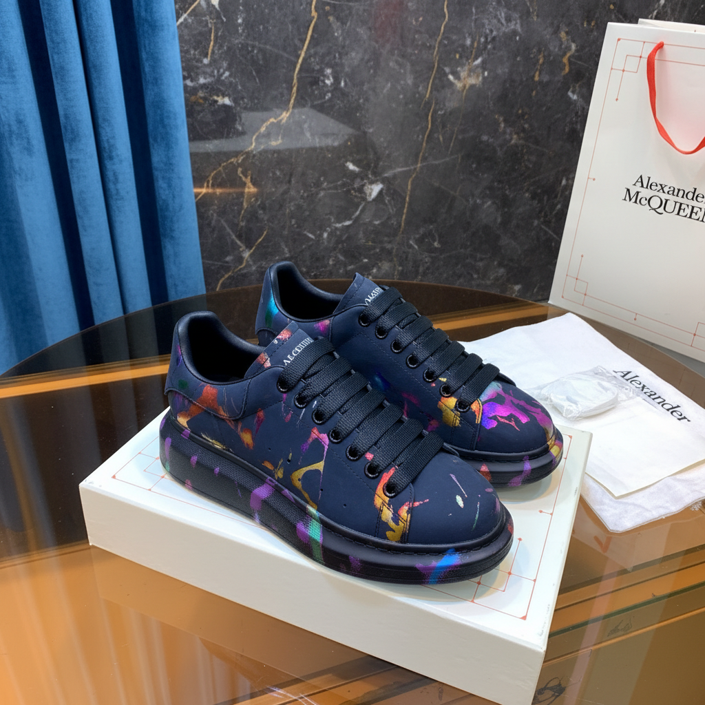 Alexander McQueen black sneakers with vibrant multicolor paint splatter design, chunky sole, and premium craftsmanship for a bold, stylish look.