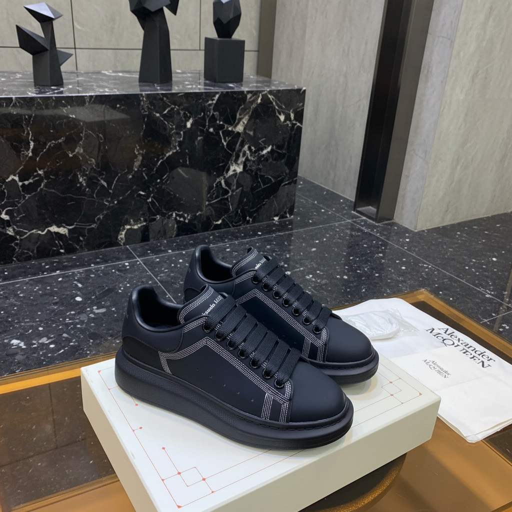 Alexander McQueen Black Oversized Sneakers with contrast white stitching, premium leather, and chunky sole for stylish comfort and modern streetwear appeal.