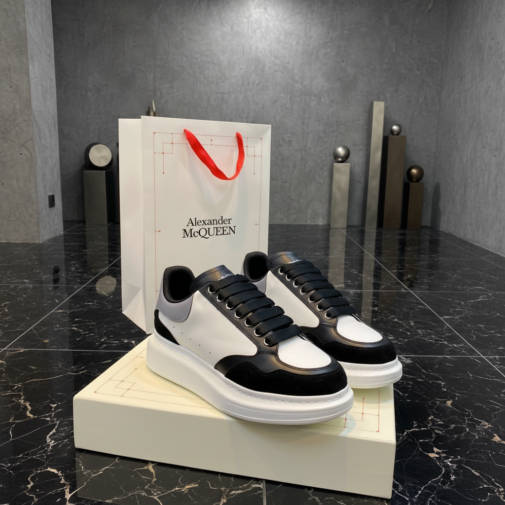 Alexander McQueen black and white leather sneakers, stylish chunky sole design, premium craftsmanship, perfect for casual and streetwear fashion.