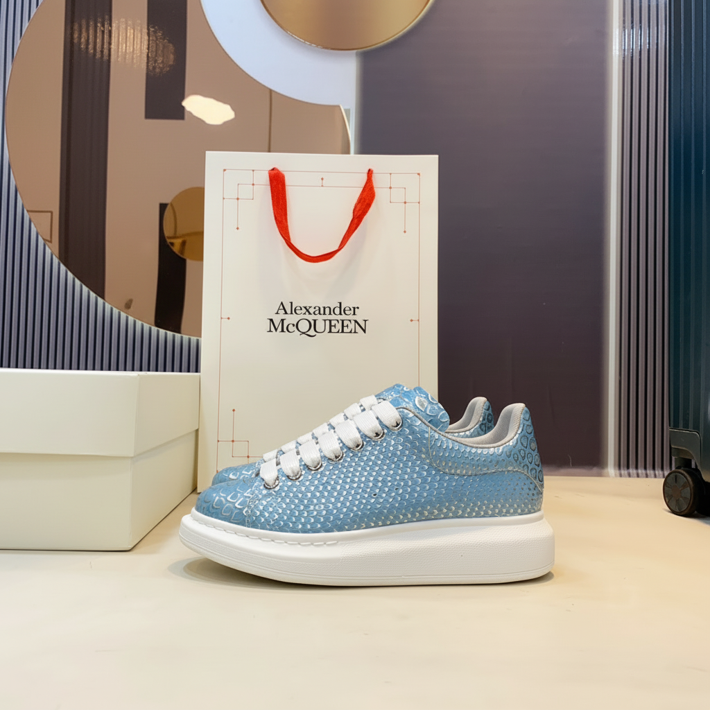 Alexander McQueen blue embossed leather sneakers with white laces and platform sole, stylish luxury footwear perfect for casual and trendy outfits.