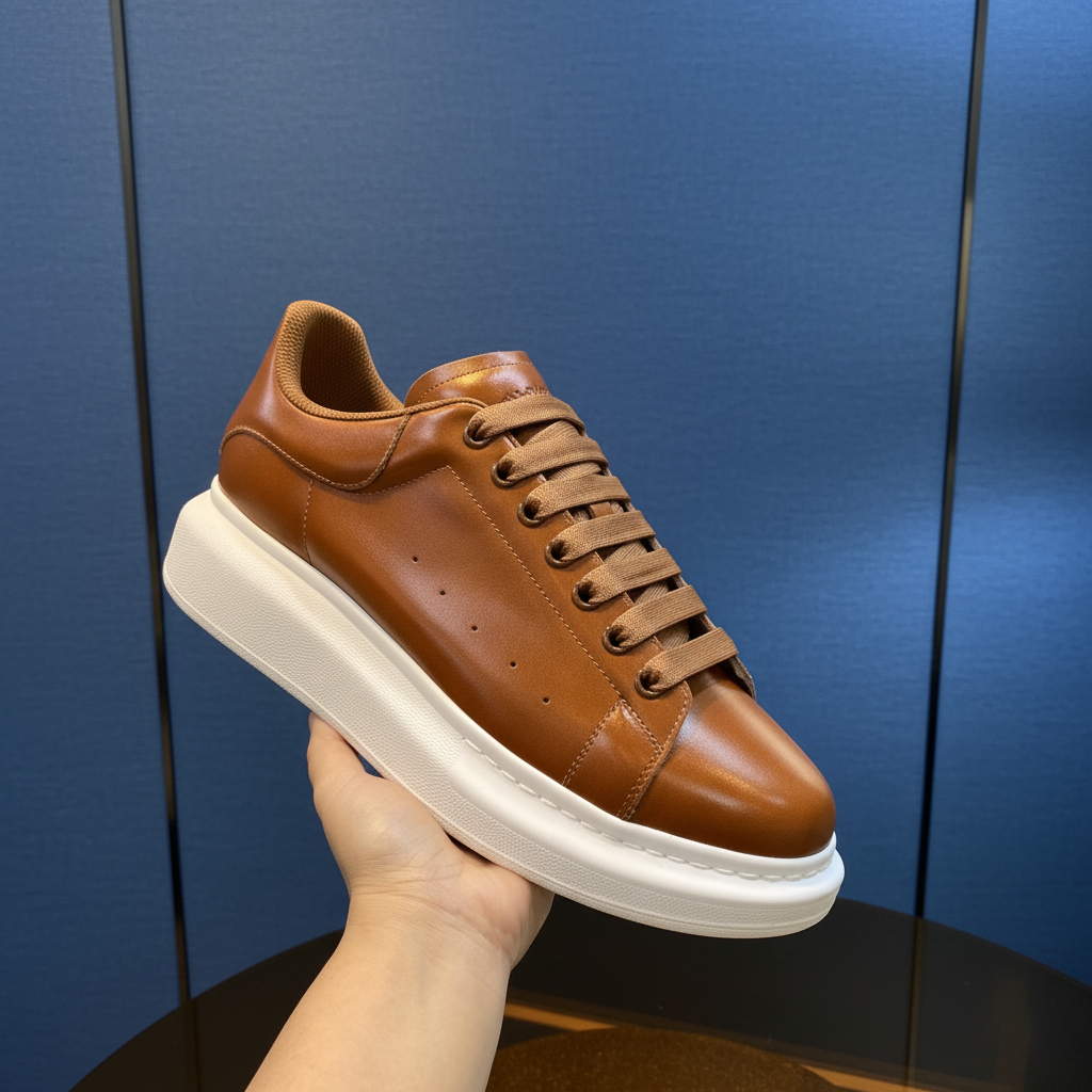 Alexander McQueen brown leather oversized sneakers with sleek design, wide sole, and premium craftsmanship for stylish comfort and modern fashion appeal.